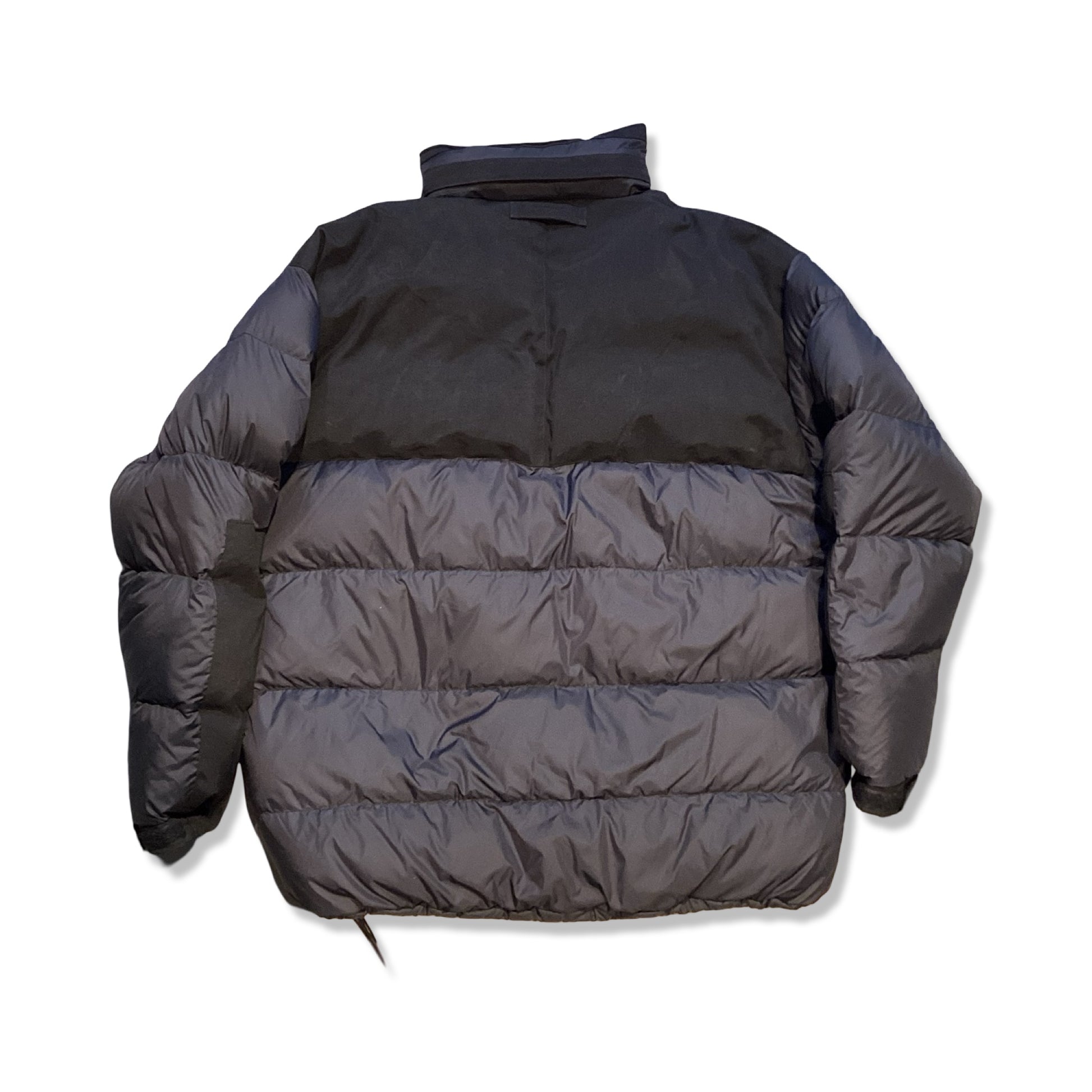 Diese Daunenjacke von Fjällräven hat eine klassische Puffer-Silhouette mit breiten, horizontalen Kammern. Sie ist zweifarbig in Schwarz und Dunkelgrau gehalten, trägt ein dezentes Fjällräven-Emblem auf der Brust und besitzt einen hohen, schützenden Kragen.