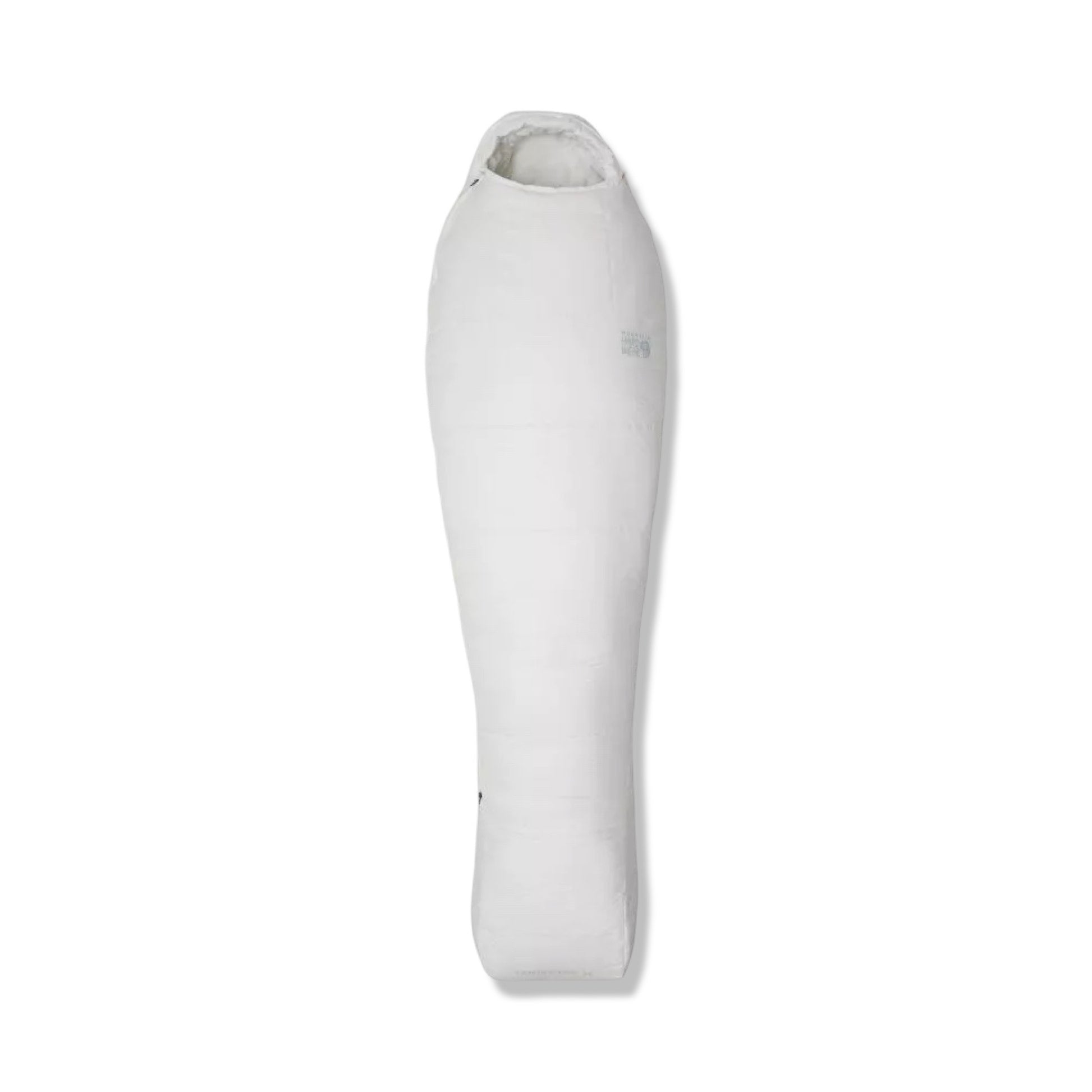 Mountain Hardwear Lamina Eco AF -9 °C ist ein mumienförmiger Schlafsack in einem ungefärbten, weißen Farbton. Die Gestaltung ist bewusst clean und minimalistisch mit Kapuze und dezentem Mountain-Hardwear-Logo. Das Modell wurde mit starkem Fokus auf Nachhaltigkeit entwickelt; die neutrale Farbe entsteht, weil das Gewebe nicht gefärbt wird.
