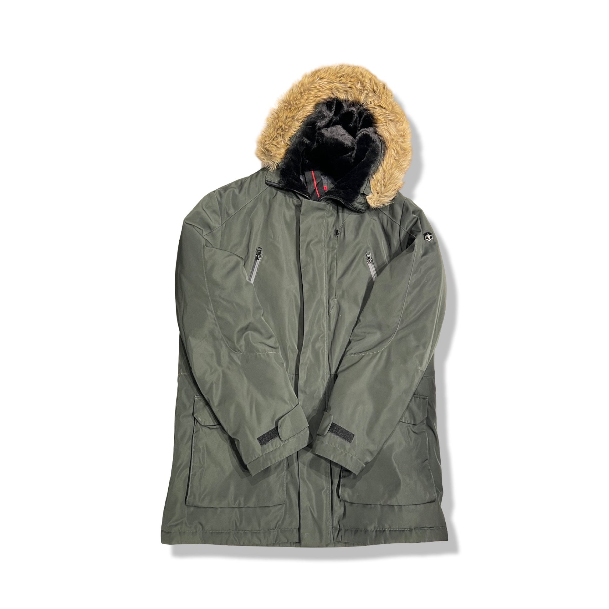 Die Jacke ist länger geschnitten und bietet dadurch guten Schutz. Die Kapuze ist mit einem Kunstpelzrand versehen und weich, wärmend gefüttert. Vorn sorgt ein durchgehender Reißverschluss mit Windleiste dafür, dass Zugluft draußen bleibt. Zwei Brusttaschen mit Reißverschluss und große Fronttaschen mit Patte bieten praktische Aufbewahrung, und Klettverschlüsse an den Ärmelabschlüssen erleichtern die Anpassung der Passform.