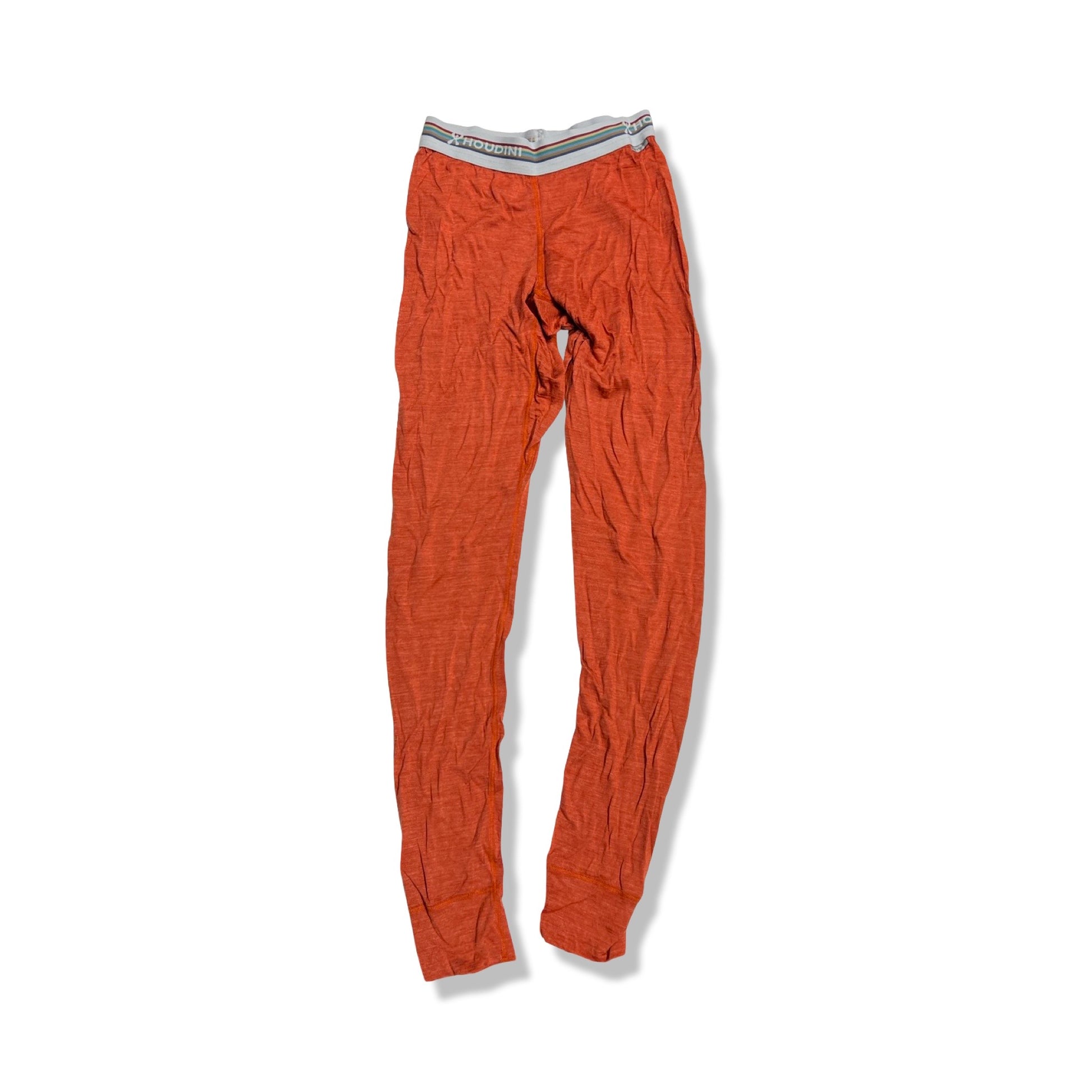 Baselayer-Hose von Houdini aus Merinowolle, konzipiert als erste Lage. Sie ist leicht und weich mit einer körpernahen Silhouette und kommt in Orange. Der Bund ist elastisch und trägt einen sichtbaren Houdini-Schriftzug.