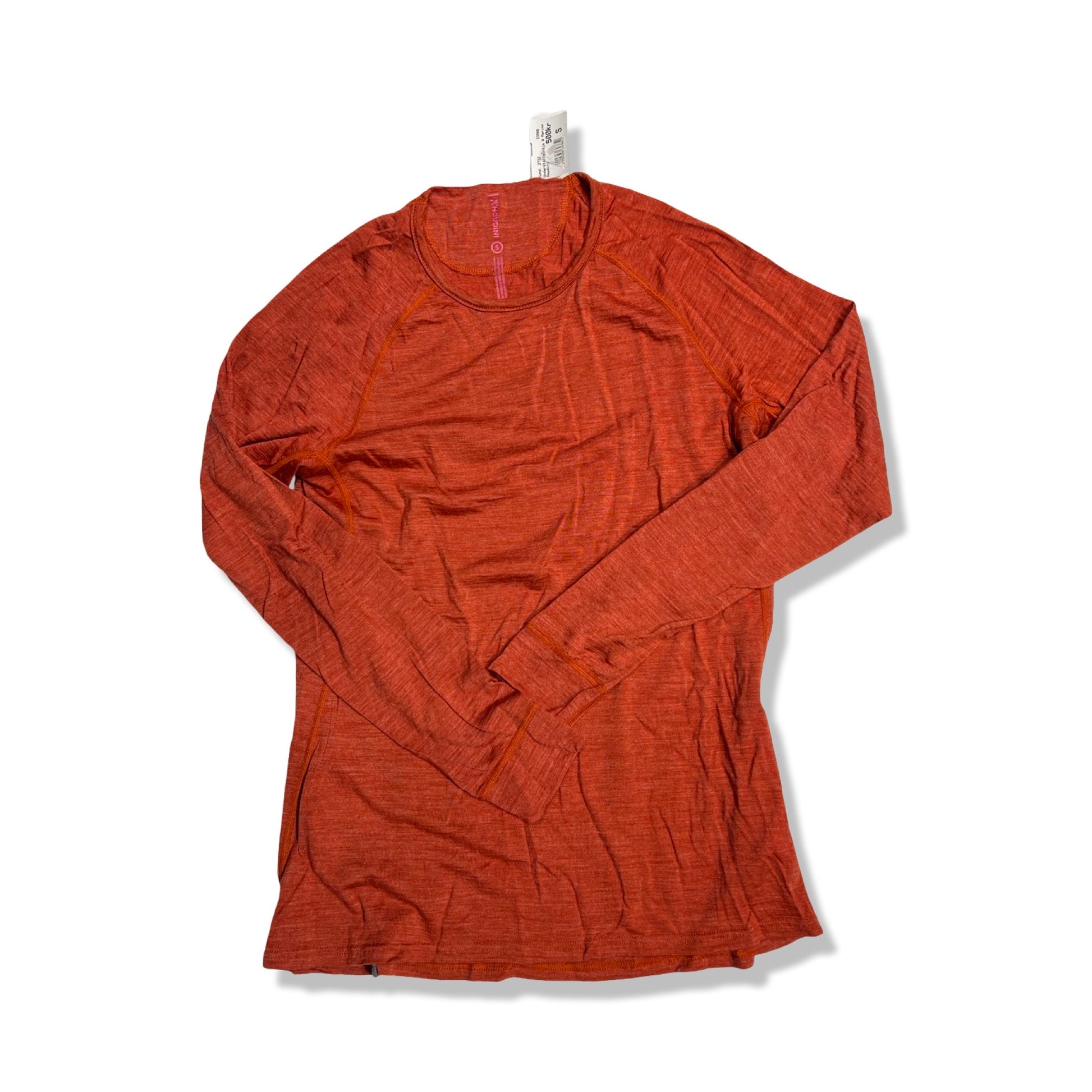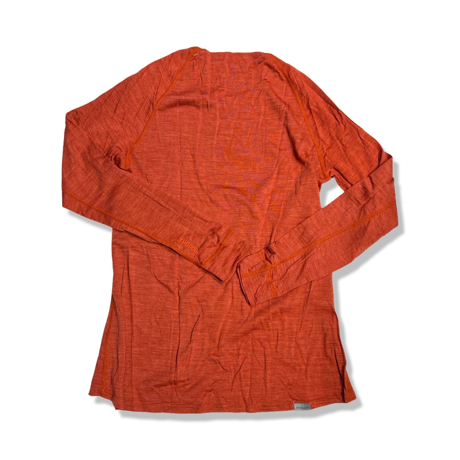 Baselayer-Langarmshirt von Houdini mit Rundhalsausschnitt. Das Kleidungsstück ist in einem melierten Orangeton gehalten und besticht durch ein klares, minimalistisches Design. Ein dezentes Houdini-Logo ist am Ärmel zu sehen, dazu ein kleines Label am unteren Saum.