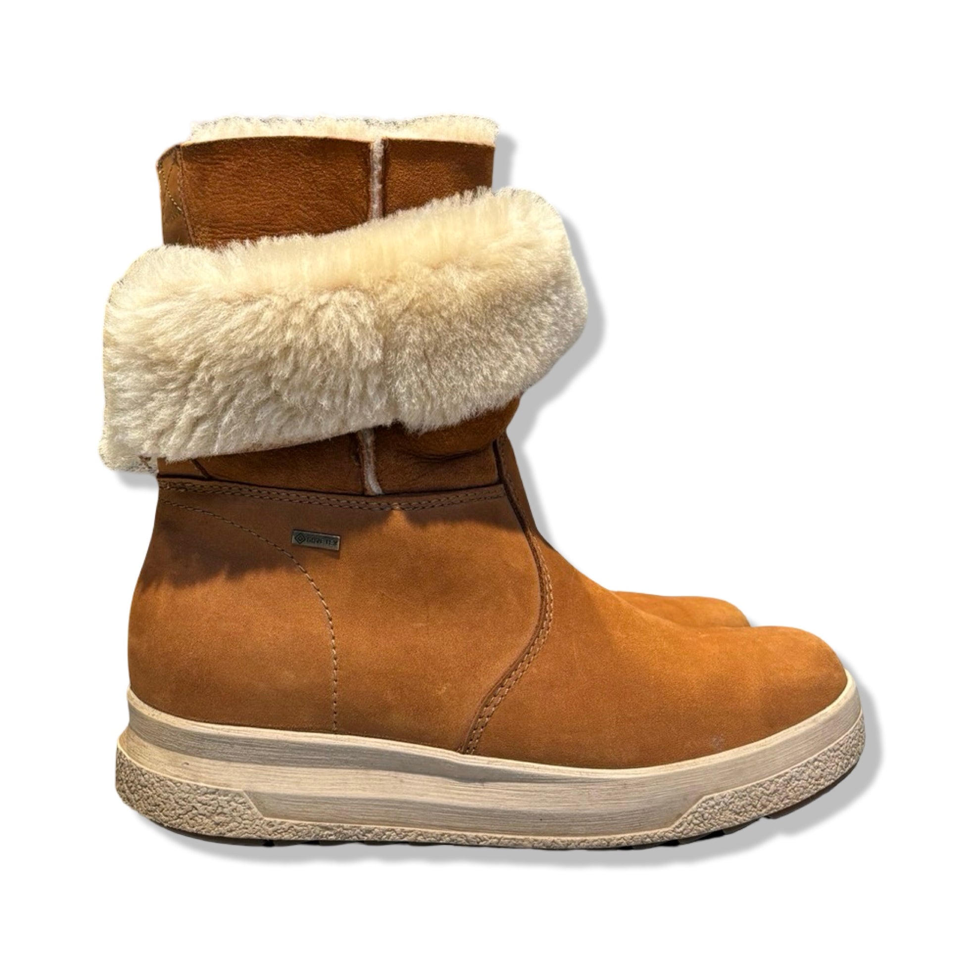 The upper combines water‑ and dirt‑repellent nubuck and suede, backed by a waterproof, windproof GORE‑TEX membrane that breathes to keep feet dry and comfortable. Inside, a thick sheepskin lining adds cozy insulation, and the removable footbed is also sheepskin‑covered for extra warmth and cushioning.