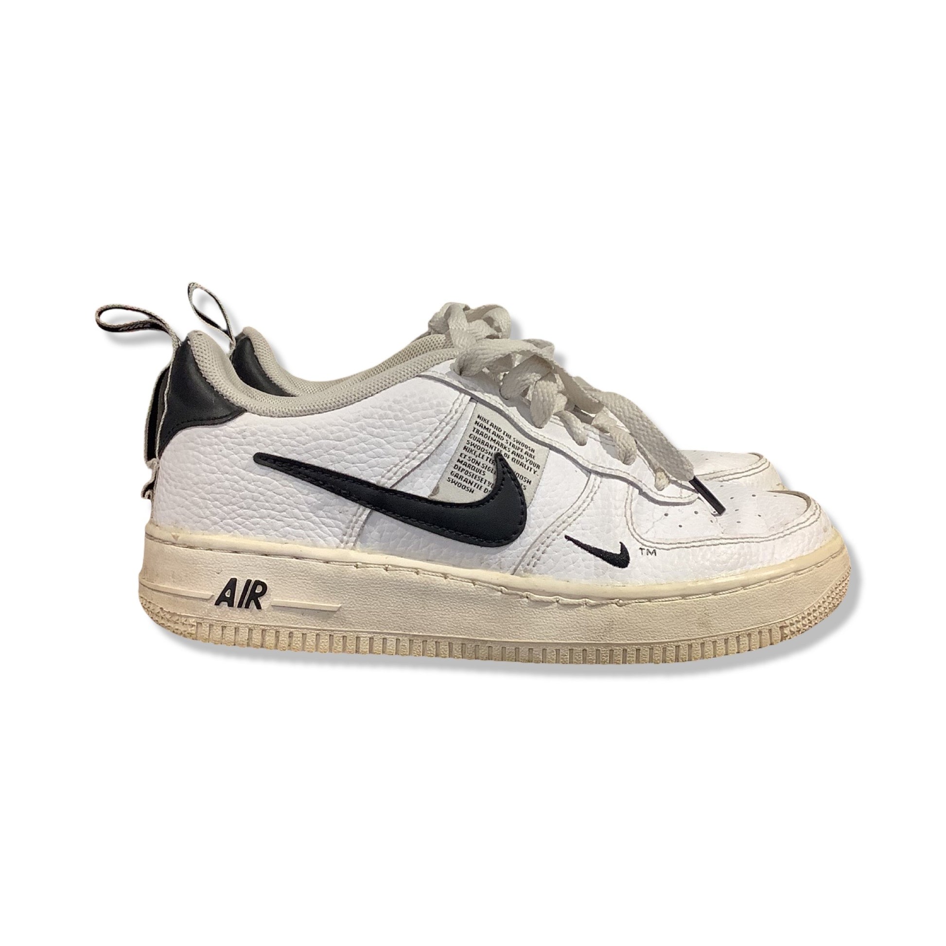 Nike Air Force 1 Low Utility White Black GS släpptes 2018 och ger en modern twist på den ursprungliga AF1-siluetten. Den vita läderovandeln har unika element, som en synlig etikett på fjärdedelen. Mini-Nike Swooshes finns på stänkskyddets inre och laterala sidor, vid hälen och under de skarpa vita snörena.