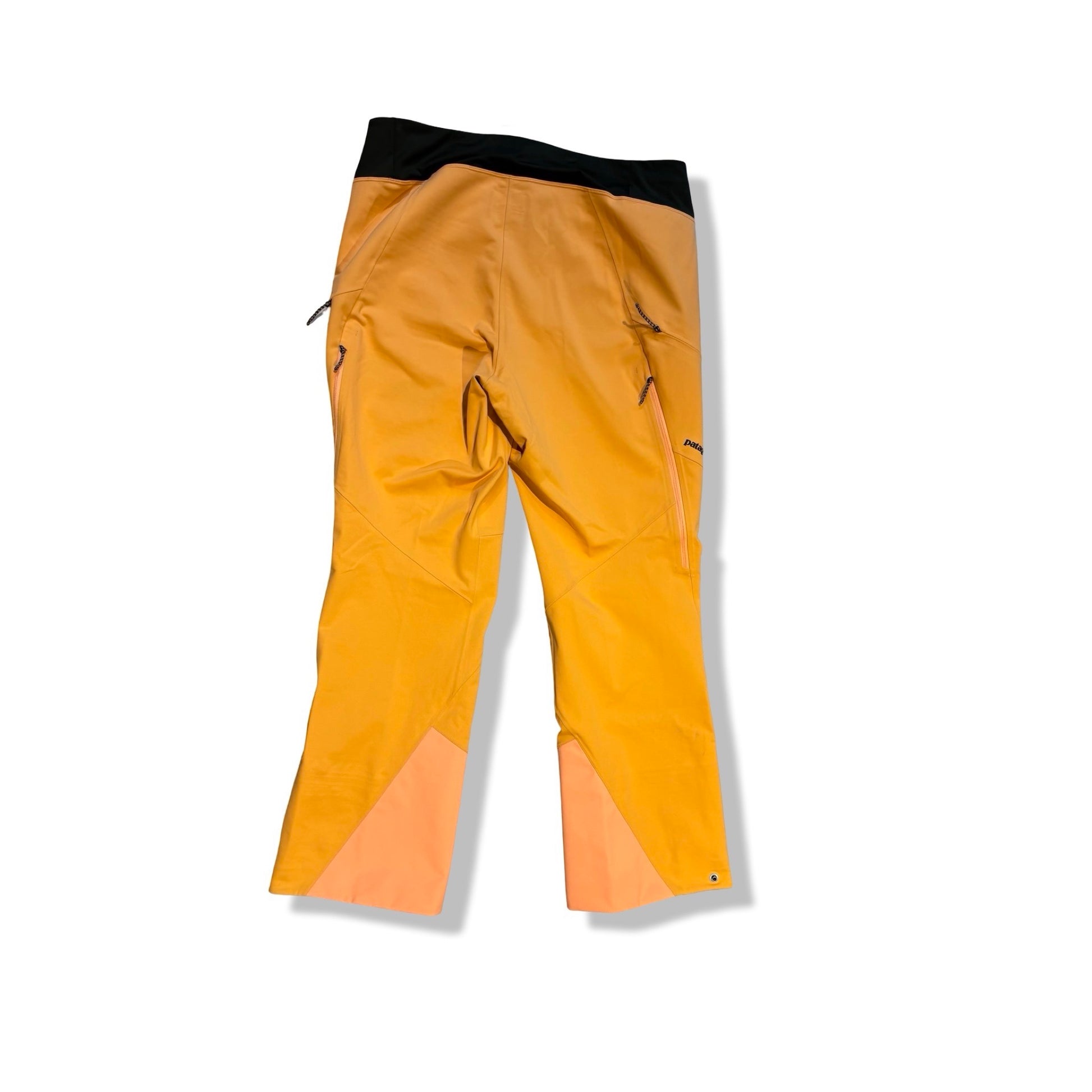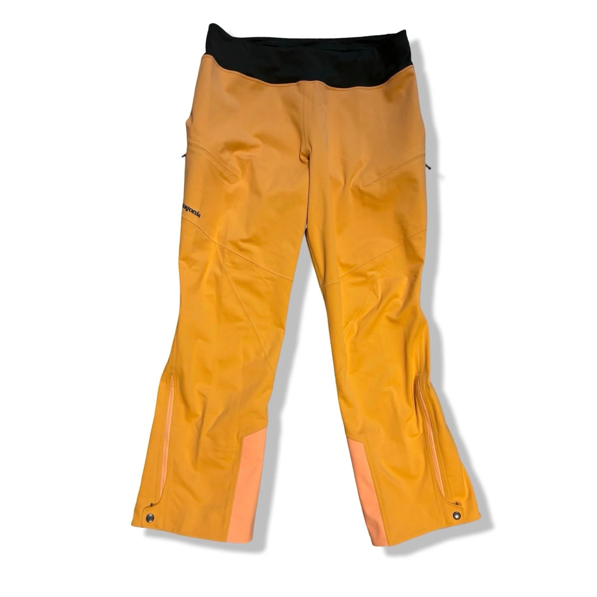 Tekniska softshellbyxor från Patagonia i en ljus orange färg med kontrasterande ljusare paneler vid bensluten och en svart, mjuk midjepanel. Silhuetten är rak med lätt utsvängda benslut och panelerade sömmar som ger en rörlig, följsam känsla. En diskret Patagonia-logga syns på låret.