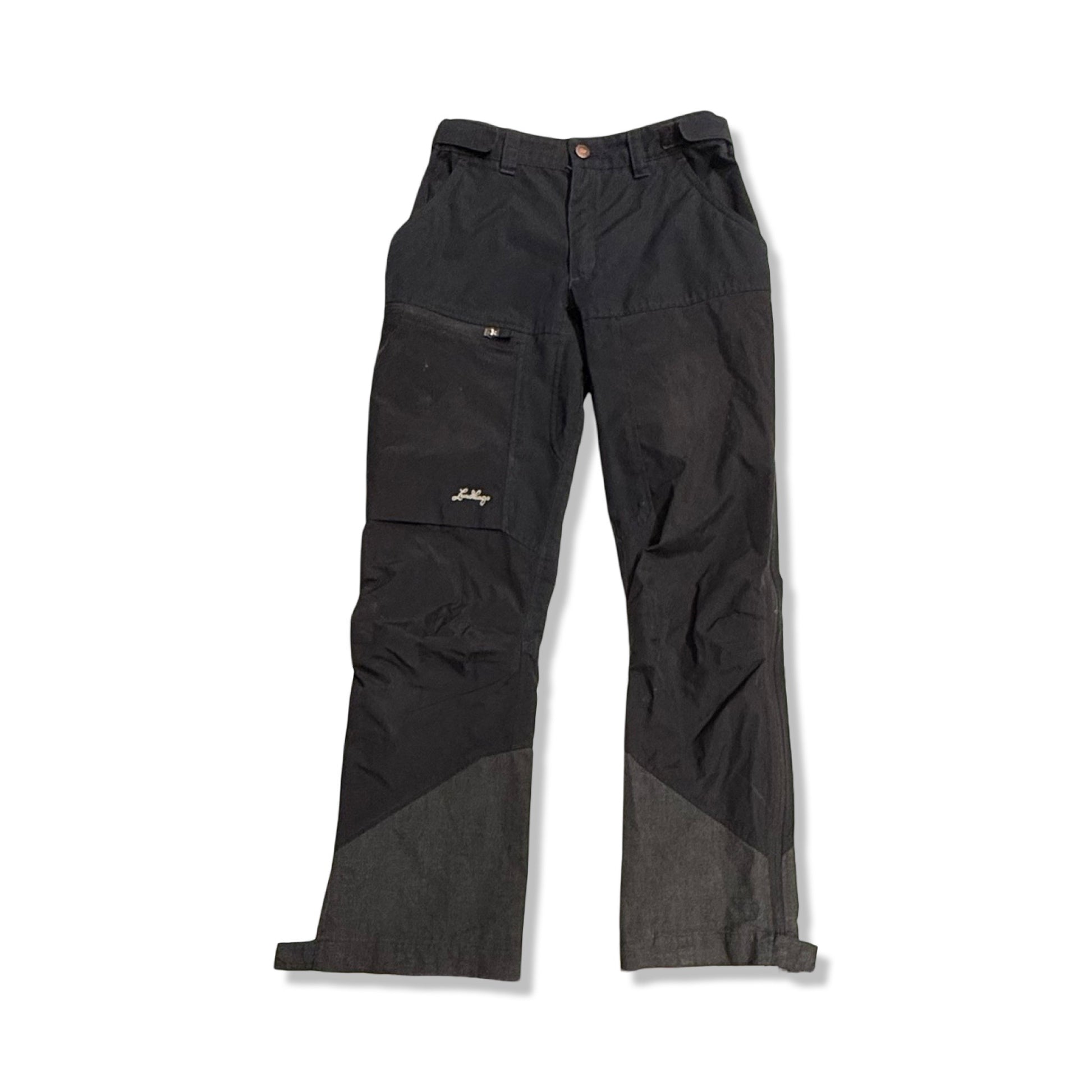 Vandringsbyxa från Lundhags i svart med mörkgrå kontrastpaneler. Silhuetten är rak och funktionell, med tydliga förstärkningar över knä och nedre ben. På låret syns en broderad Lundhags-logotyp som diskret detalj.