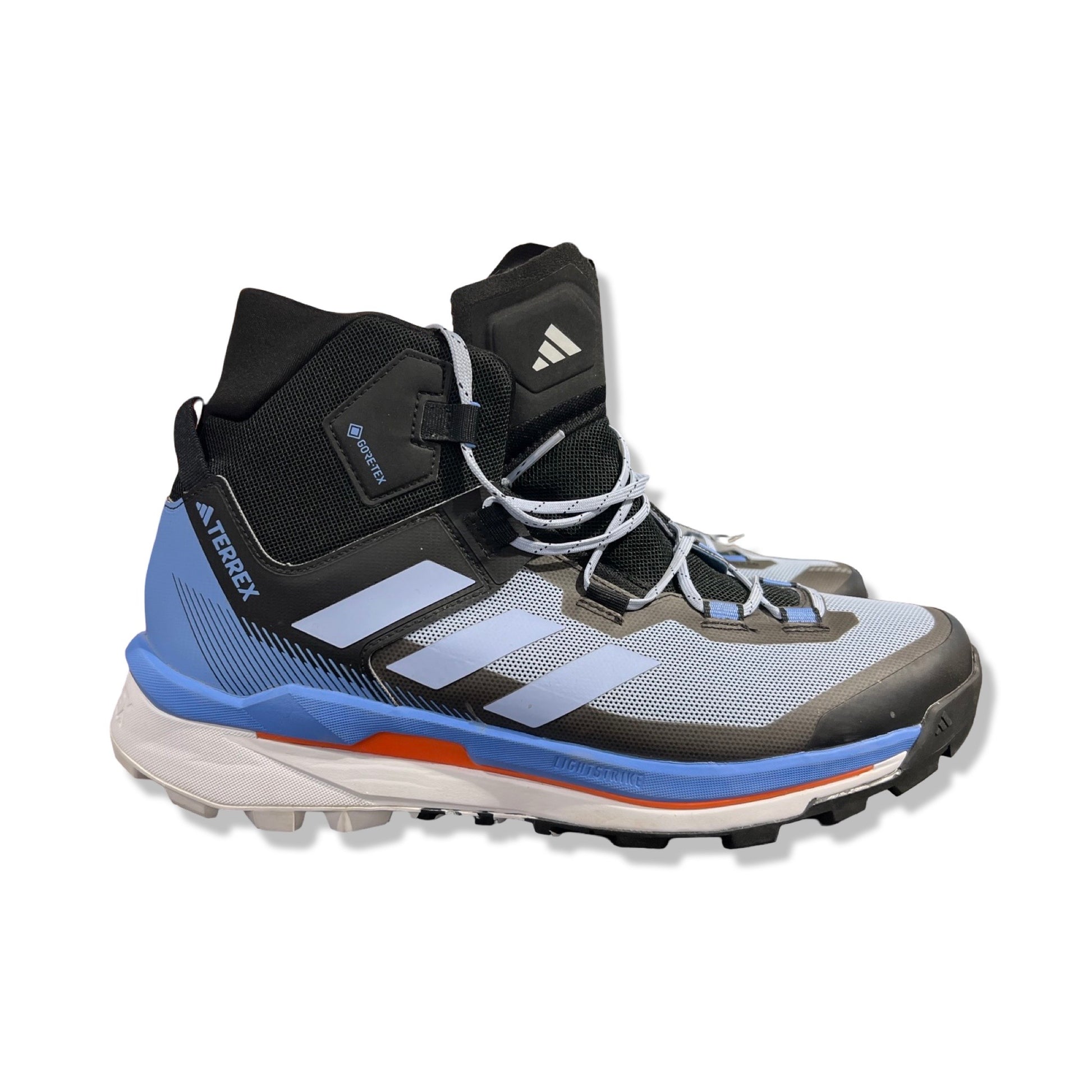 Ovandelen är gjord i slitstark textil med sömlösa förstärkningar, och ett vattentätt samt ventilerande GORE-TEX-membran håller fötterna torra när vädret vänder. Den medelhöga designen ger tryggt vriststöd, medan Lightstrike EVA-dämpning ger en responsiv känsla under längre timmar på leden. En integrerad Pebax-platta stabiliserar steget och skyddar mot vassa stenar. Yttersulan i Stealth Hf-gummi ger grepp i toppklass på våta som torra underlag, med ett klätteranpassat framfotsparti för precision och ett mer traditionellt mönster baktill för effektivt frånskjut.
