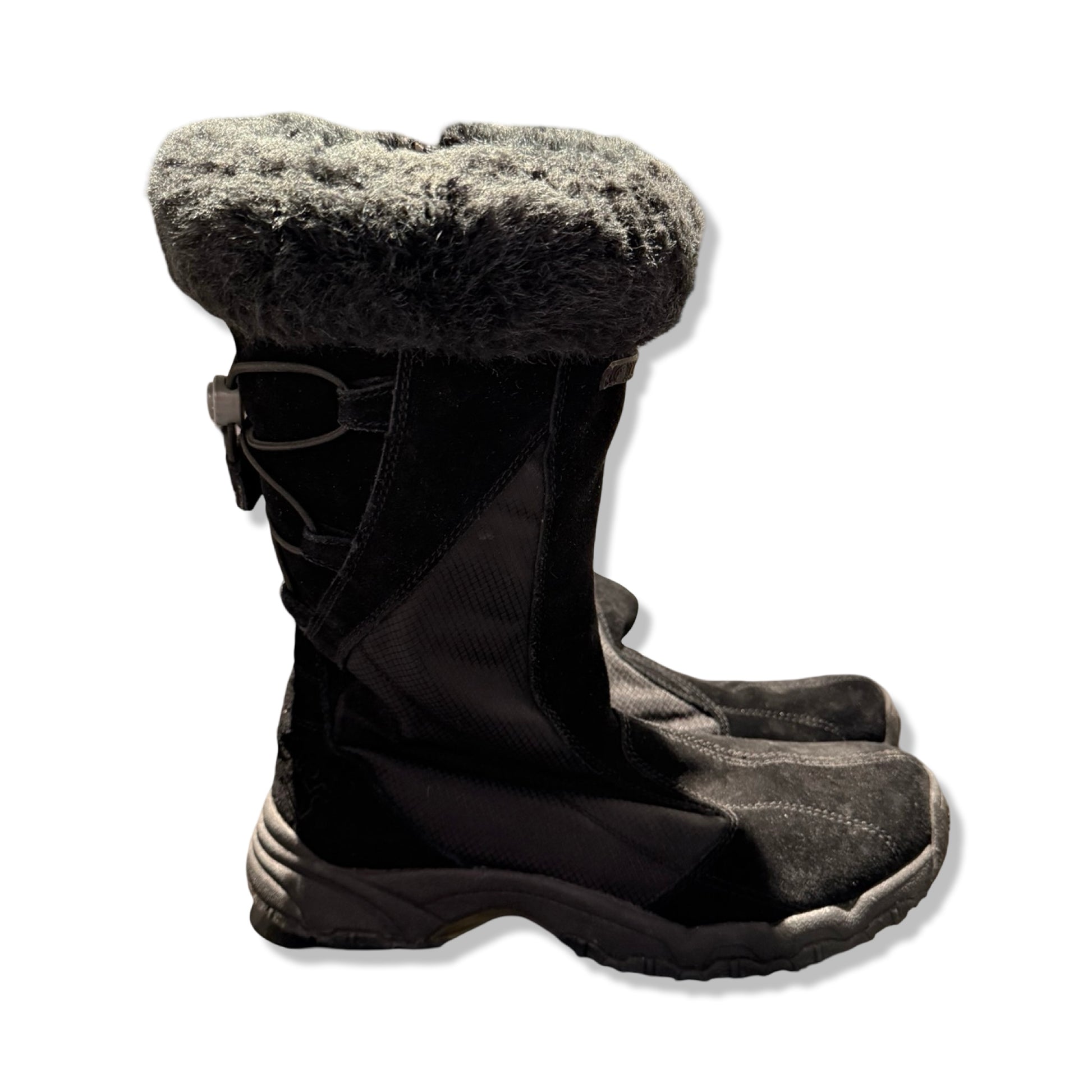 Det höga skaftet ger extra skydd och värme, och den mjuka kragen i pälsimitation omsluter vristen behagligt. Sidodragkedjan gör dem enkla att ta på och av, medan justerande detaljer på skaftet hjälper till att finjustera passformen. Den robusta yttersulan är utrustad med dubbar som ger stabilt grepp på is och snö, så att du kan gå avslappnat även när underlaget är halt.