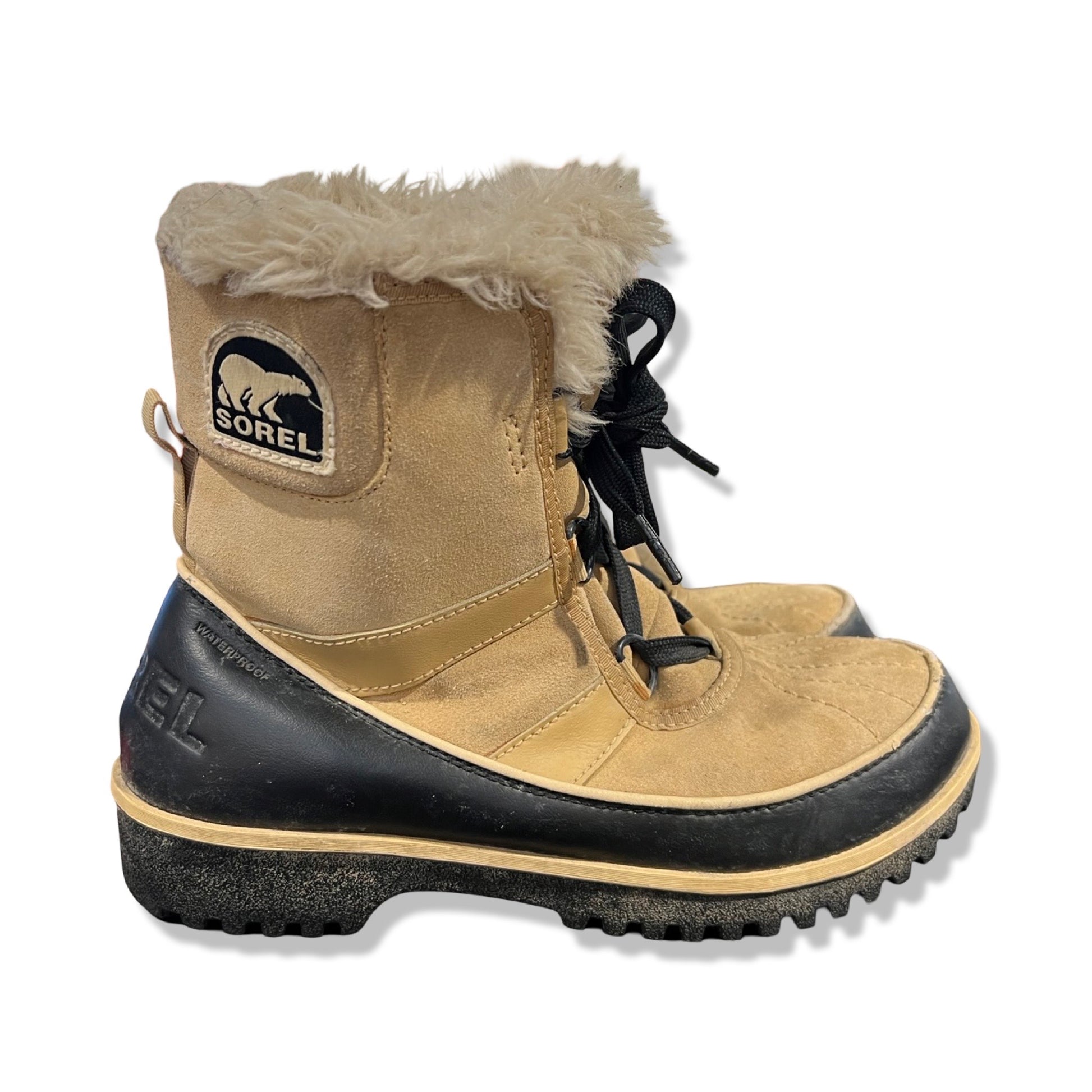 Vinterkänga från Sorel, Tivoli II, med khakifärgad ovandel och svart gummiskal. Kängan har en mjuk, fluffig fleecekant vid skaftet och klassisk snörning med svarta skosnören. Sorel-loggan syns på skaftet, och hälpartiet är märkt “Waterproof”.