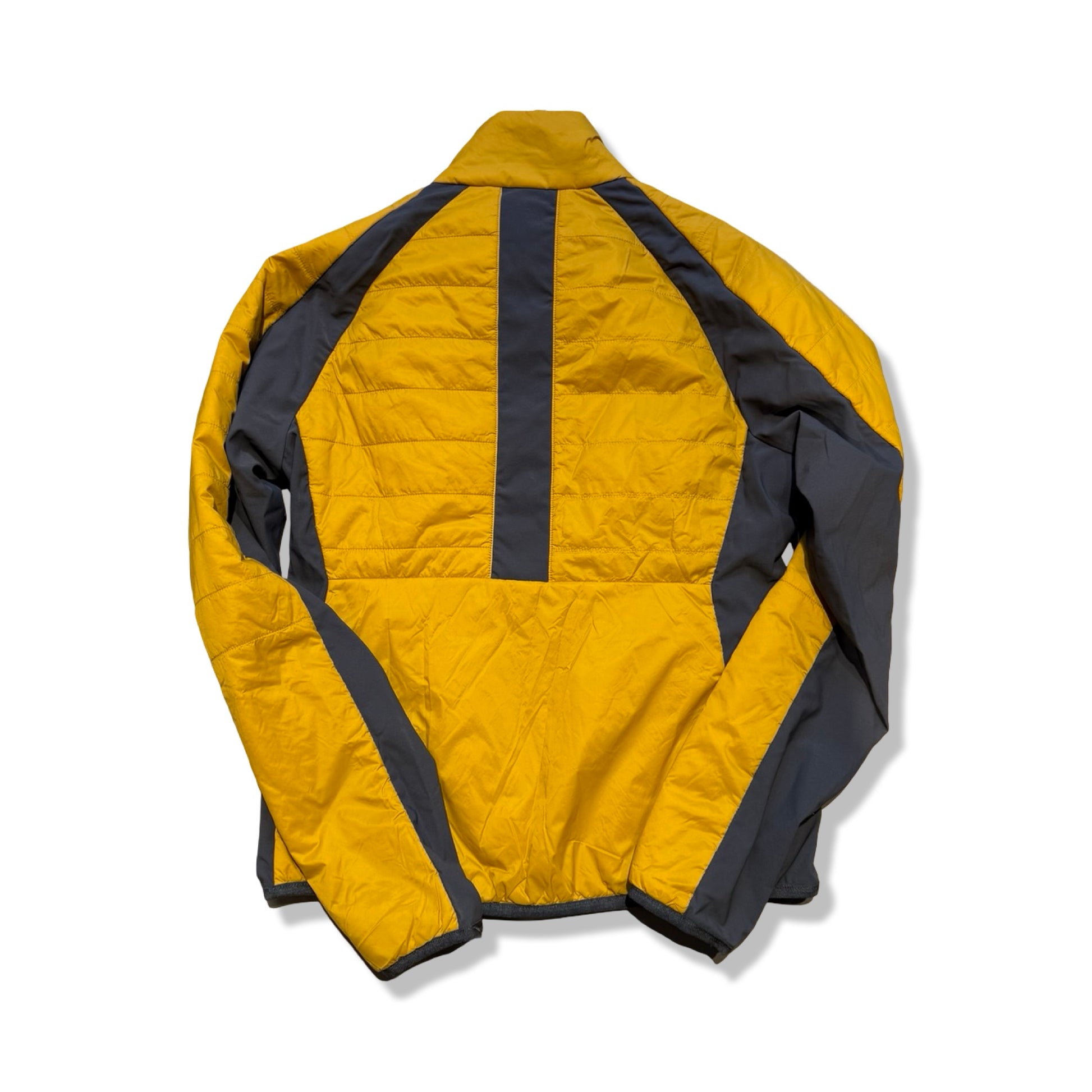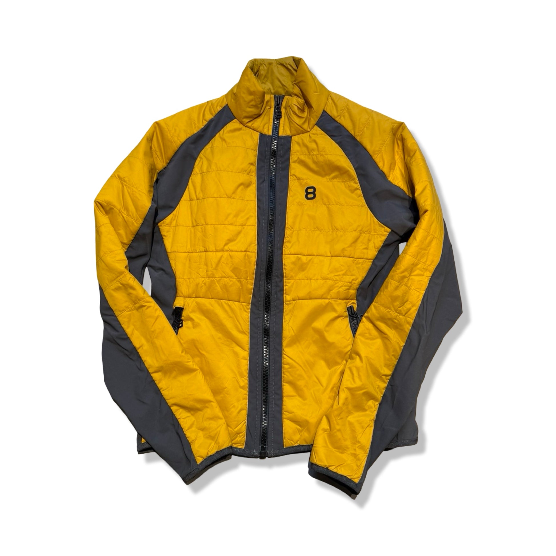 Jackan har lätt vadderade, kviltade partier som håller värmen över bål och rygg, medan slätare sidopaneler ger skön rörelsefrihet och bättre ventilation. Den är försedd med hög krage, genomgående dragkedja och två handfickor med dragkedja för säker förvaring. Kantband i ärmslut och nederkant hjälper till att stänga inne värmen.