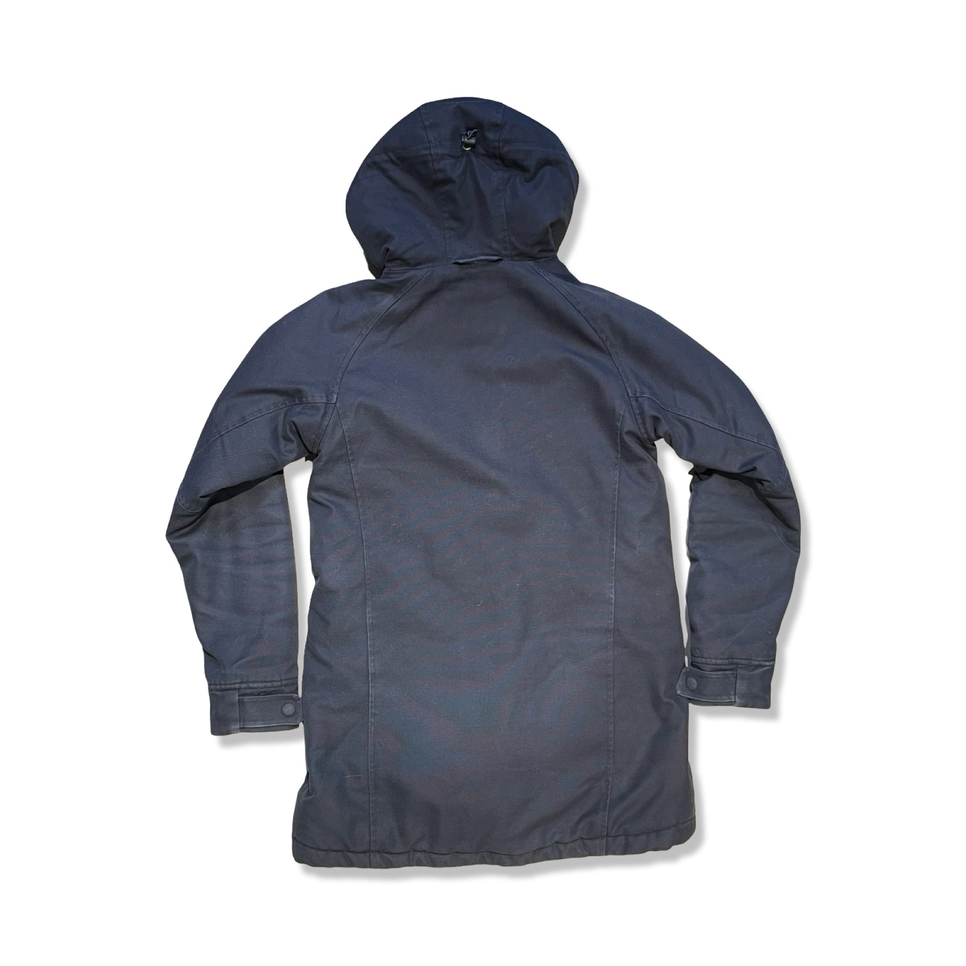 Parkas från Lundhags i marinblå färg med längre silhuett och fast huva. Diskreta Lundhags-logotyper syns på bröstet och på huvan, och de formsydda panelerna ger ett rent, funktionellt uttryck.