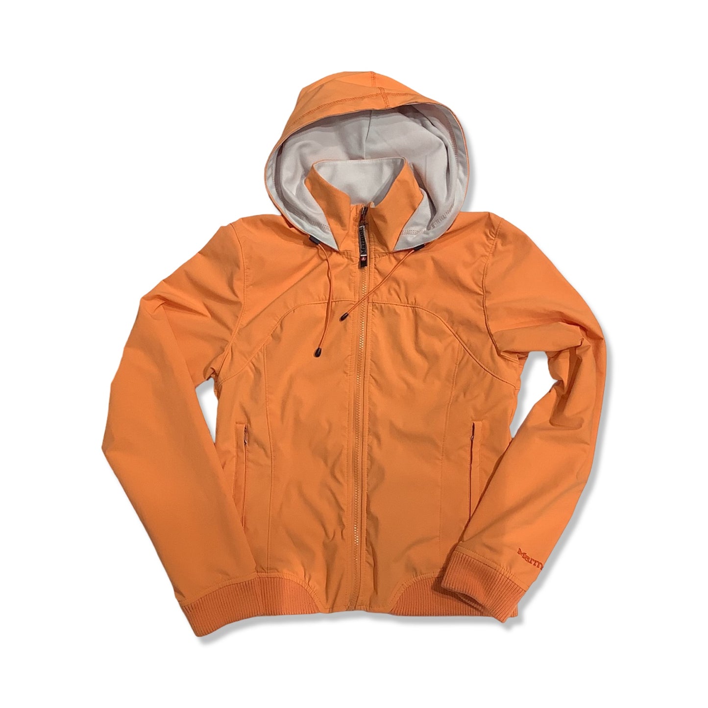 En lätt skaljacka från Marmot i modellen PreCip, i en klar grön färg. Jackan har en fast huva och hög krage samt hel dragkedja framtill. Den rena, smidiga konstruktionen gör den enkel att bära som ytterlager, och Marmot-logotypen syns diskret på bröstet.