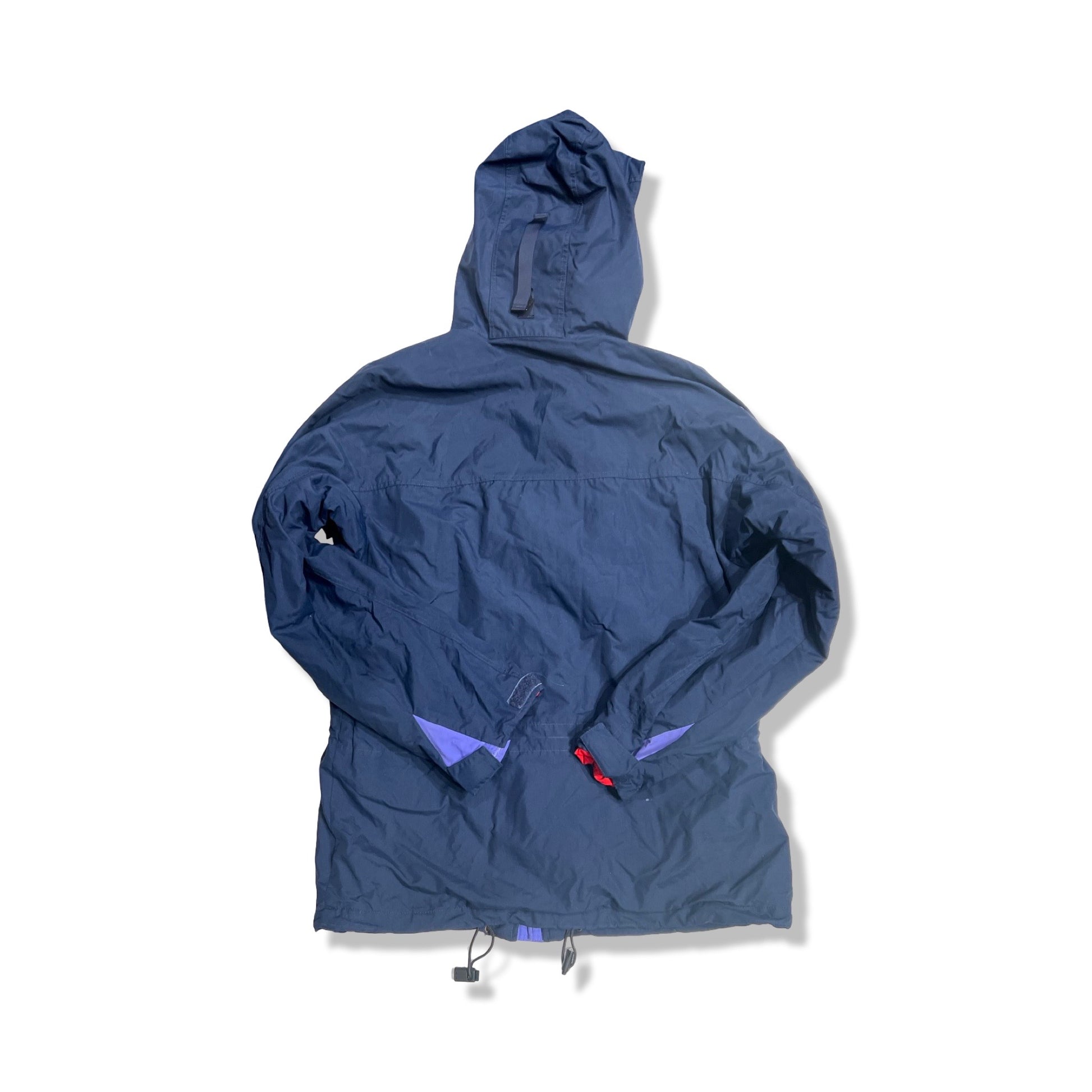 Patagonia Storm är en vädertålig skaljacka med ren, funktionell design. Yttern är djupblå med kontrasterande rött innertyg i huvan och diskreta lila detaljer vid fickor och ärmslut. Silhuetten är något längre för bra täckning, och en hög krage samt rymlig huva ger skydd när vädret slår om. Patagonia-logotypen syns på bröstet.