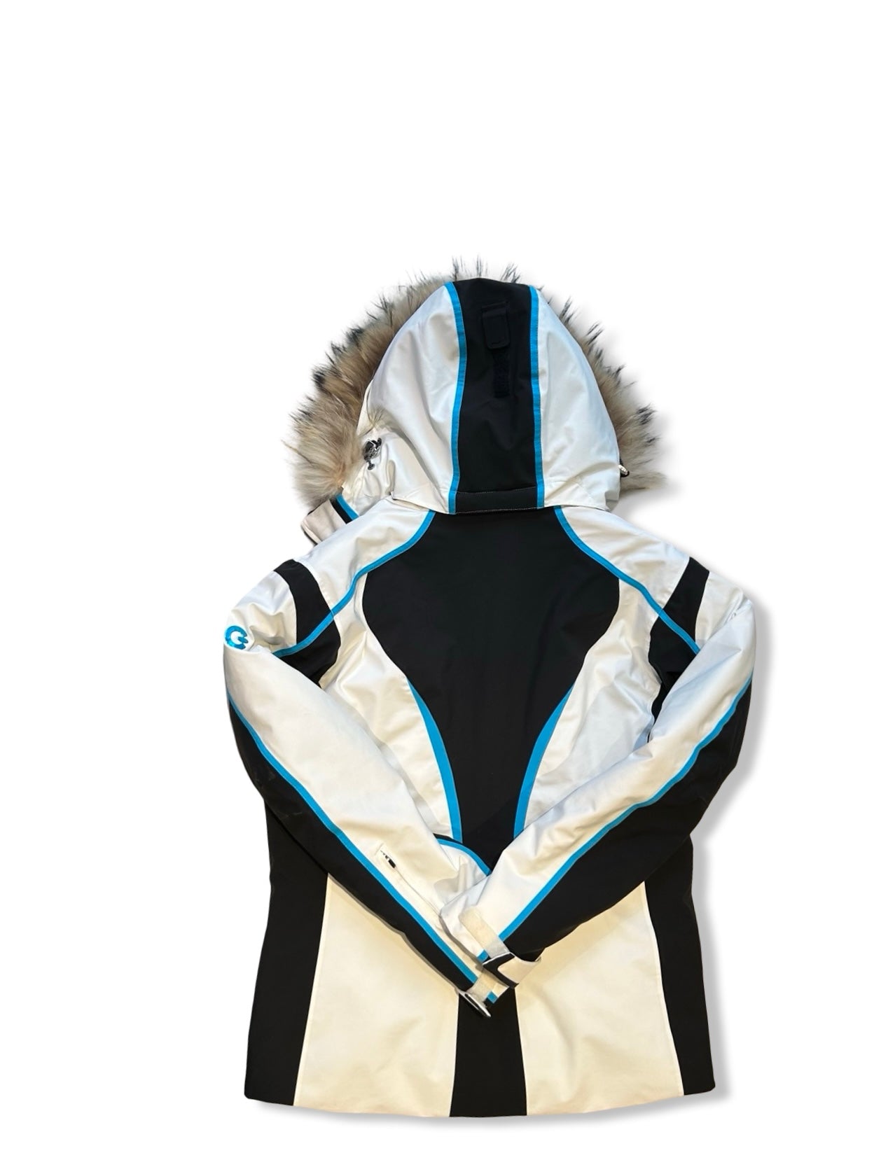 Jackan har en huva med pälskant och en hög krage som ger skydd när det blåser. Den stängs med hel dragkedja framtill och är utrustad med flera praktiska dragkedjefickor, inklusive en ärmficka. Den formsydda designen ger bra rörelsefrihet, och ett mjukt innerfoder gör den bekväm att bära under aktiva dagar på berget.