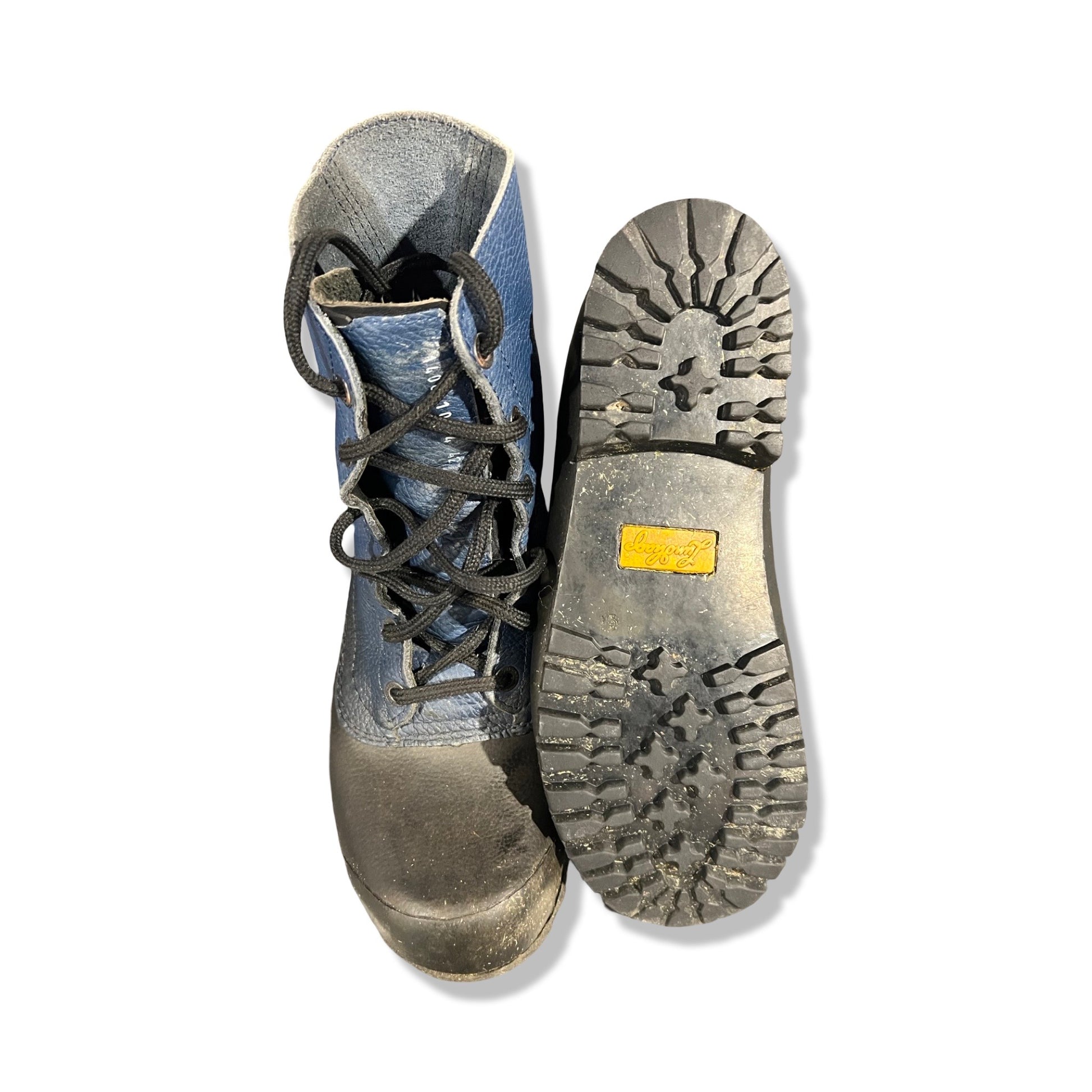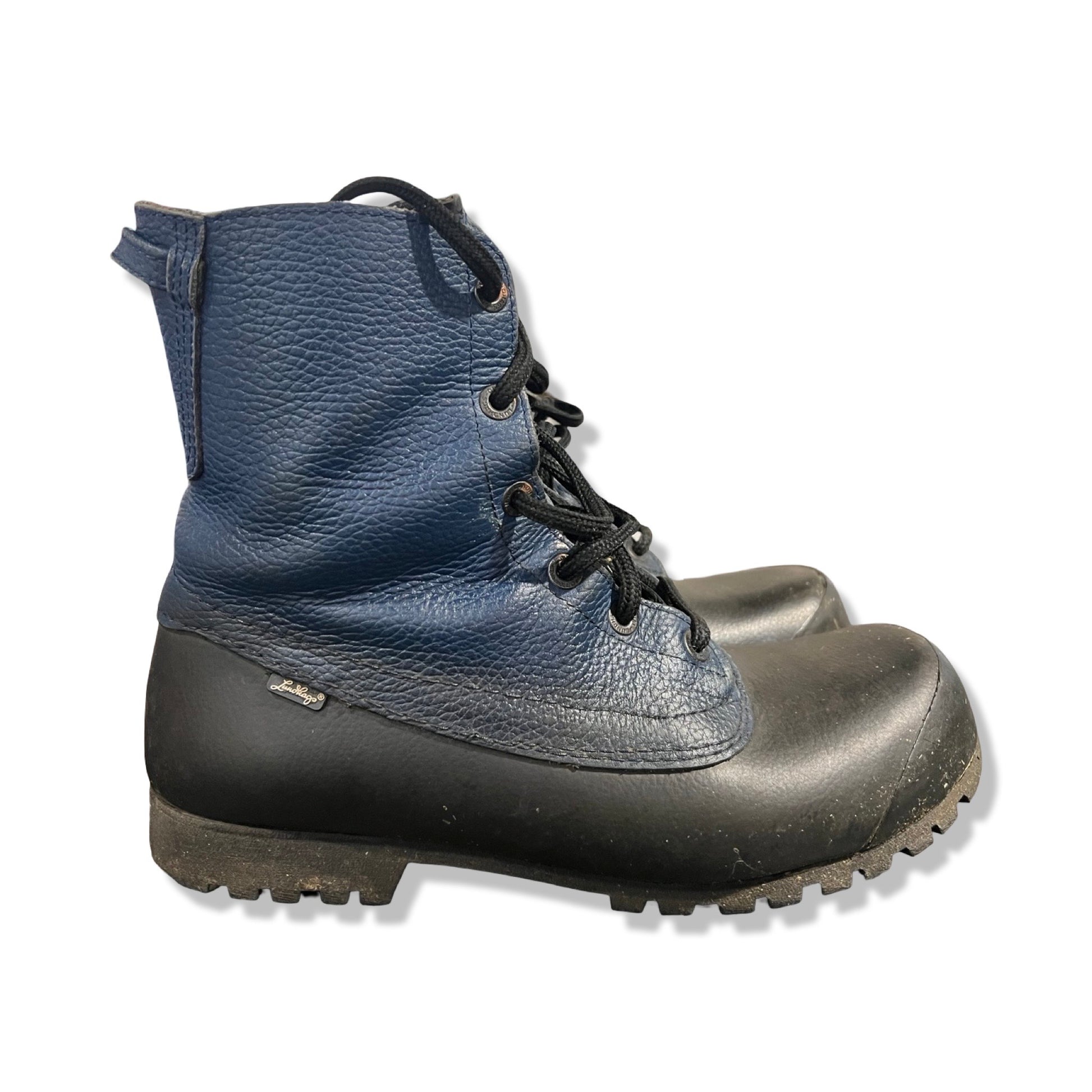 Dessa vandringskängor från Lundhags har en mörkblå ovandel i strukturerat läder kombinerat med ett skyddande gummiparti i svart runt tån och främre delen av skon. Kängorna har en mellanhög skaft som ger bra ankelstöd, och Lundhags logotyp syns diskret på sidan.
