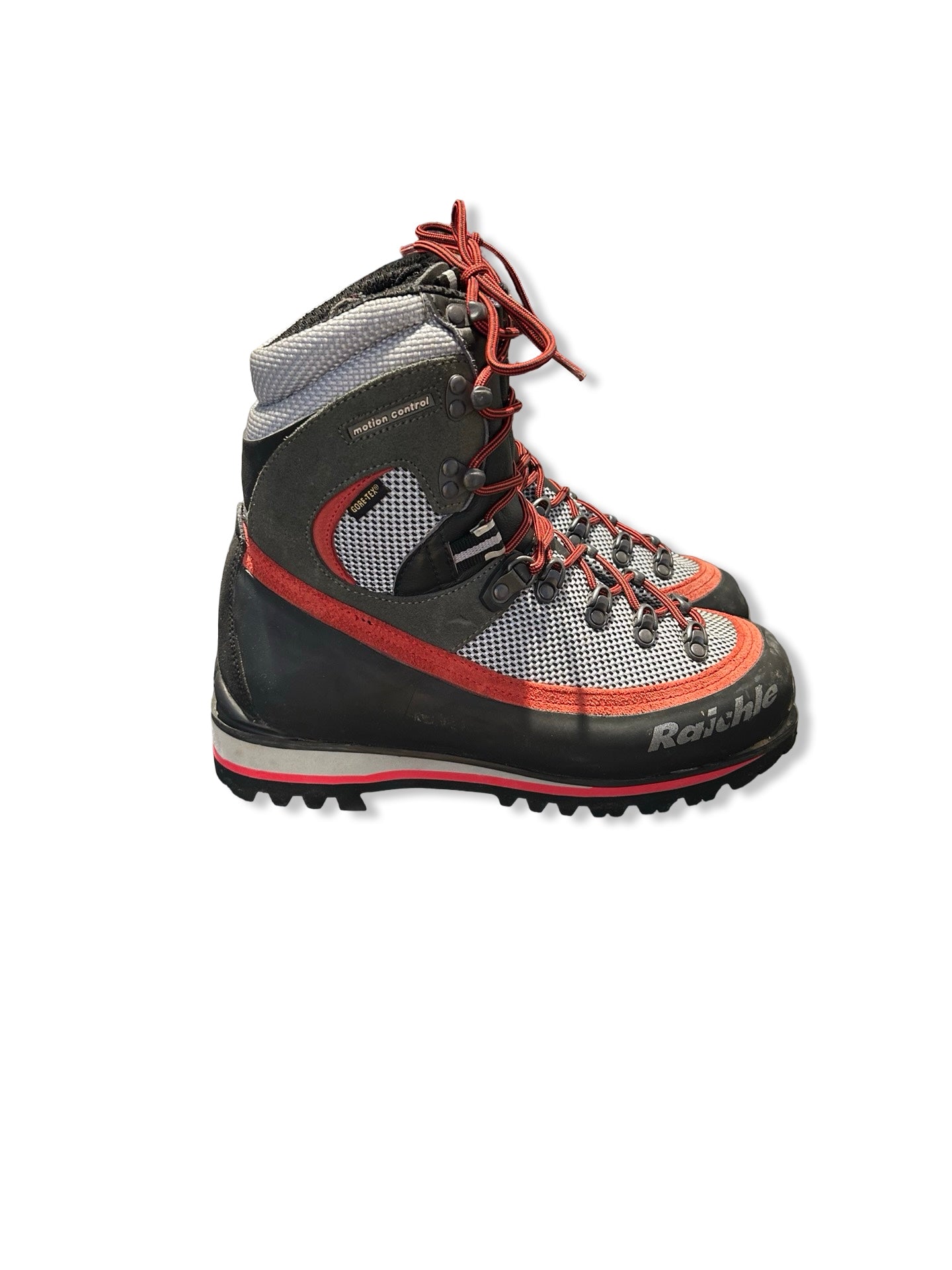 Kängan är fodrad med GORE-TEX som håller vätan ute och släpper ut fukt. Raichles Motion Control-teknologi ger extra sidostöd och hjälper till att motverka att foten viker sig, något som märks när du går med packning. En kraftig gummirand skyddar mot stötar och slitage, och en Vibram-yttersula säkerställer pålitligt grepp på både hällar och mjukare underlag. Smidig snörning med krokar gör det enkelt att finjustera passformen.