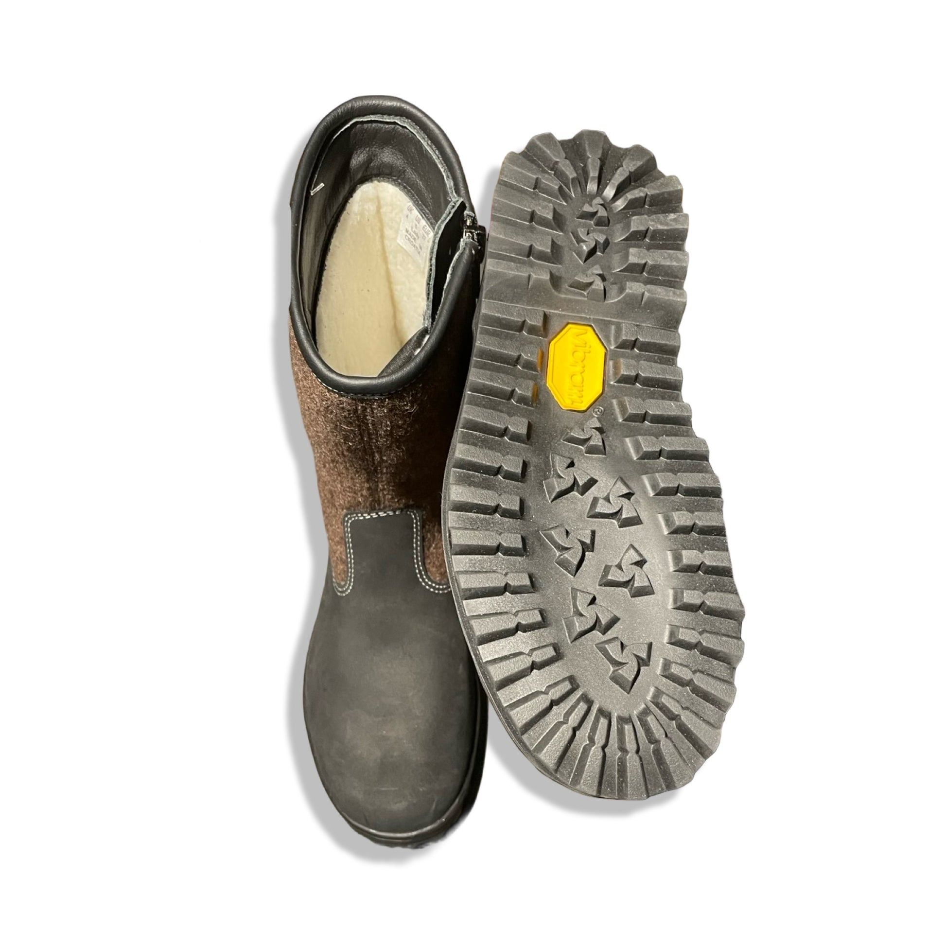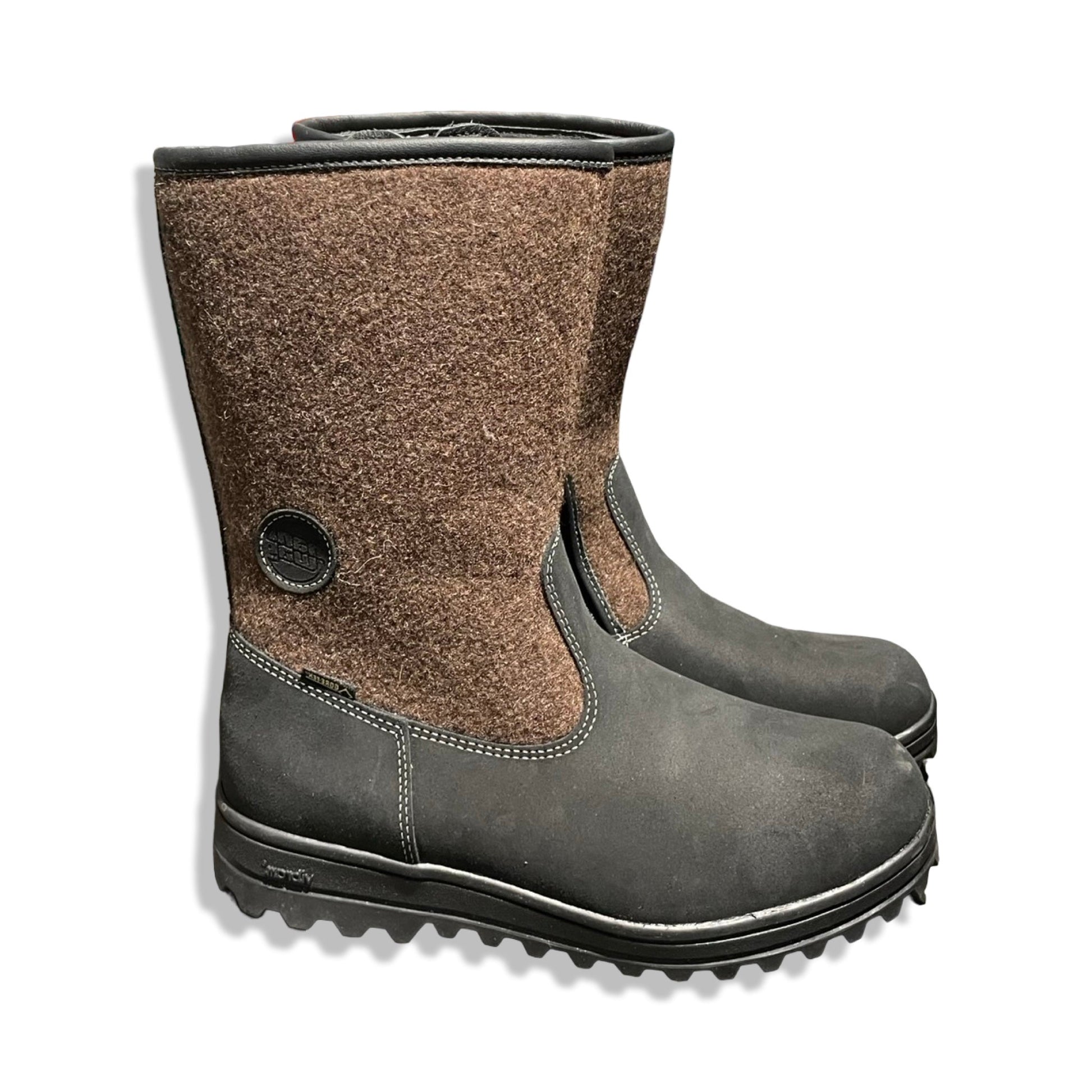 Fotdelen är gjord i slitstarkt nubuck och det höga skaftet i ullfilt ger extra isolering och skön komfort. Invändigt finns ett mjukt, värmande foder som håller fötterna behagliga när temperaturen sjunker, och en dragkedja på insidan av skaftet underlättar på- och avtagning. Under foten sitter en Vibram-yttersula med grovt mönster som levererar säkert grepp på snö och is.