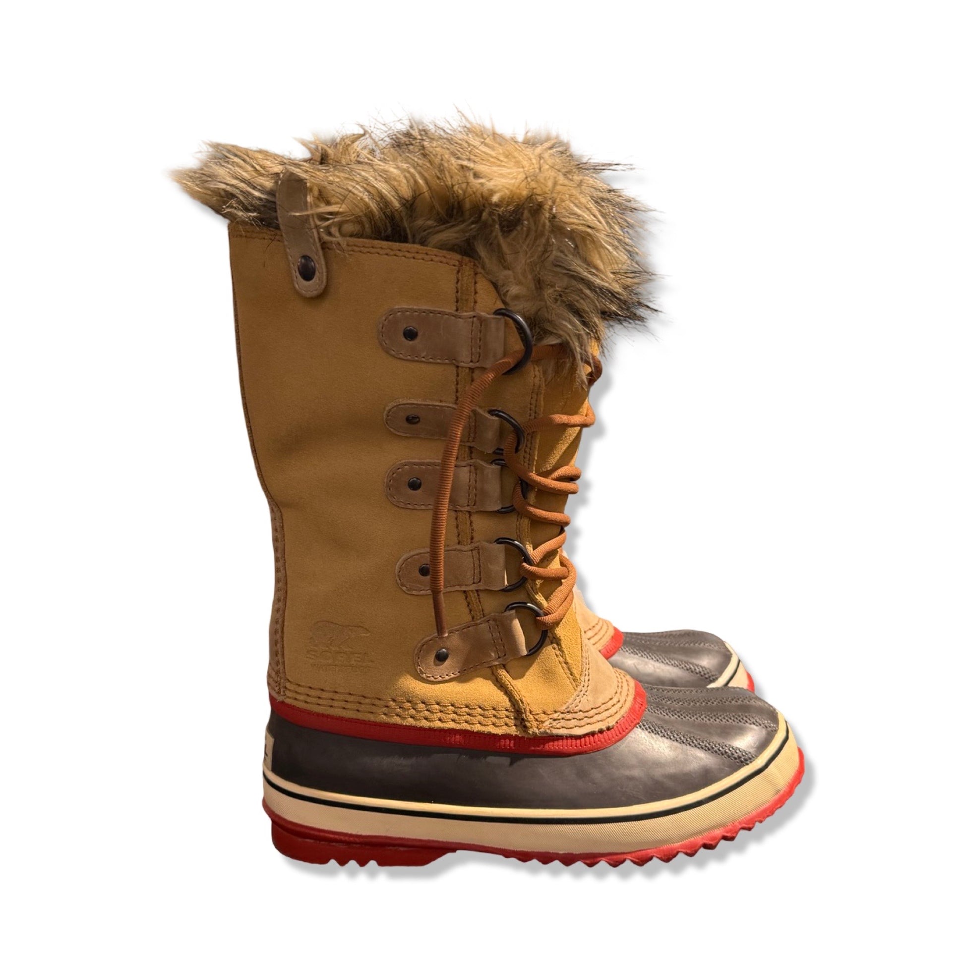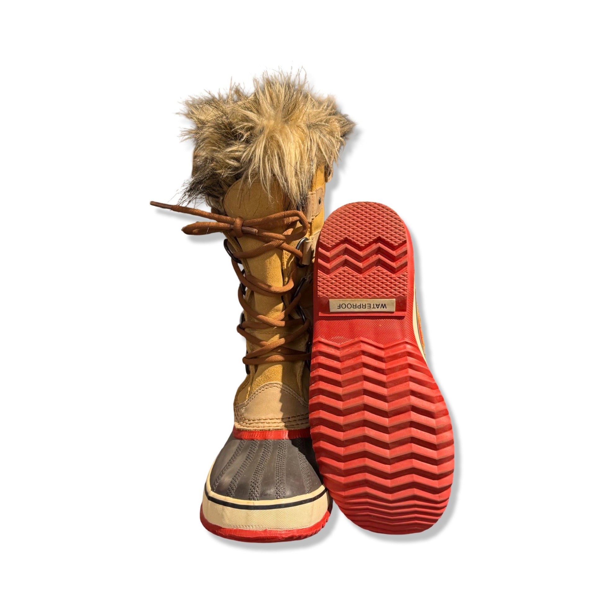 Vinterkängor från Sorel i en hög, snörad siluett med varm, mjuk syntetpäls runt skaftets kant. Ovandelen är sandfärgad medan nederdelen har ett mörkgrått gummiskal med kontrasterande crème- och röda detaljer. Sorel-logotypen syns präglad på sidan.