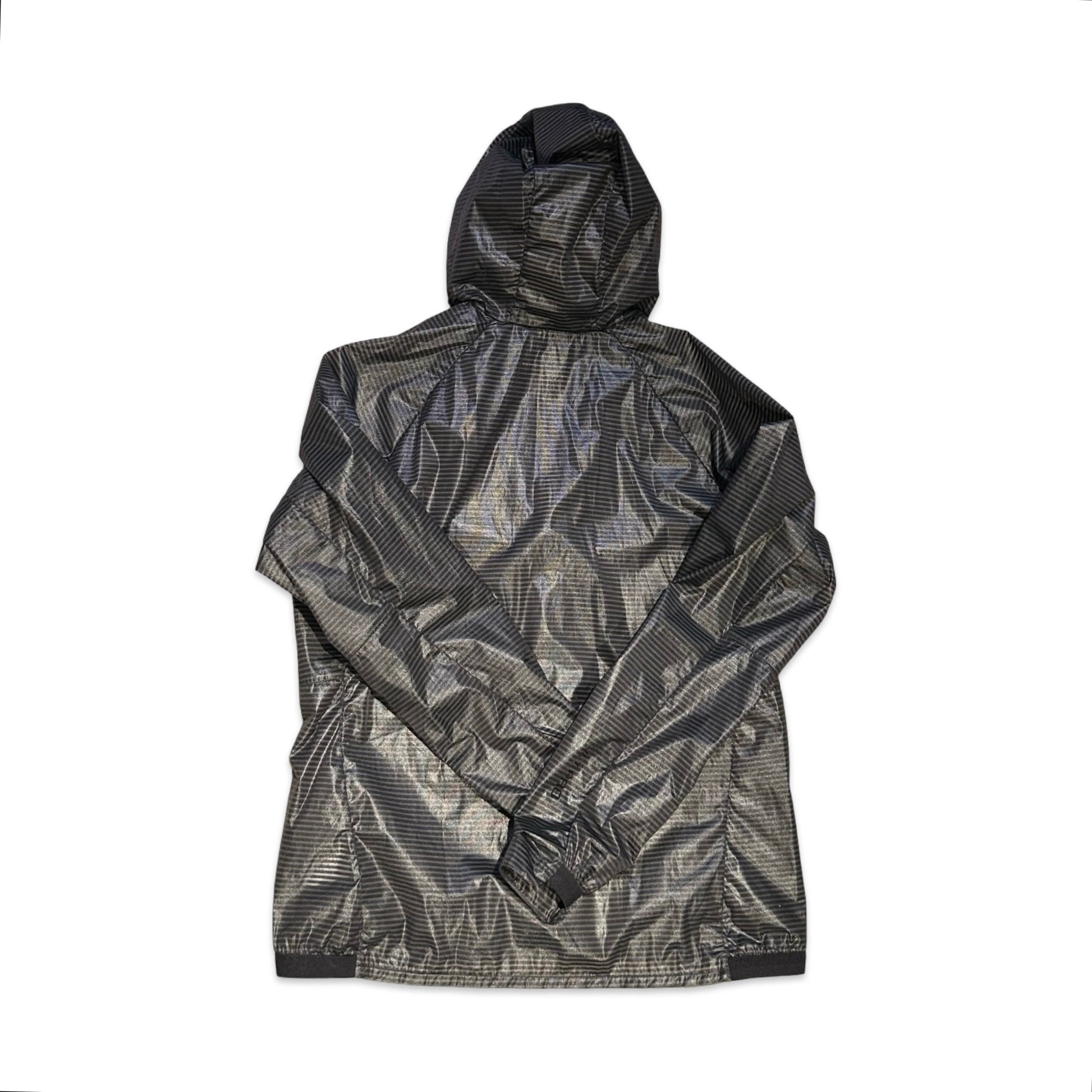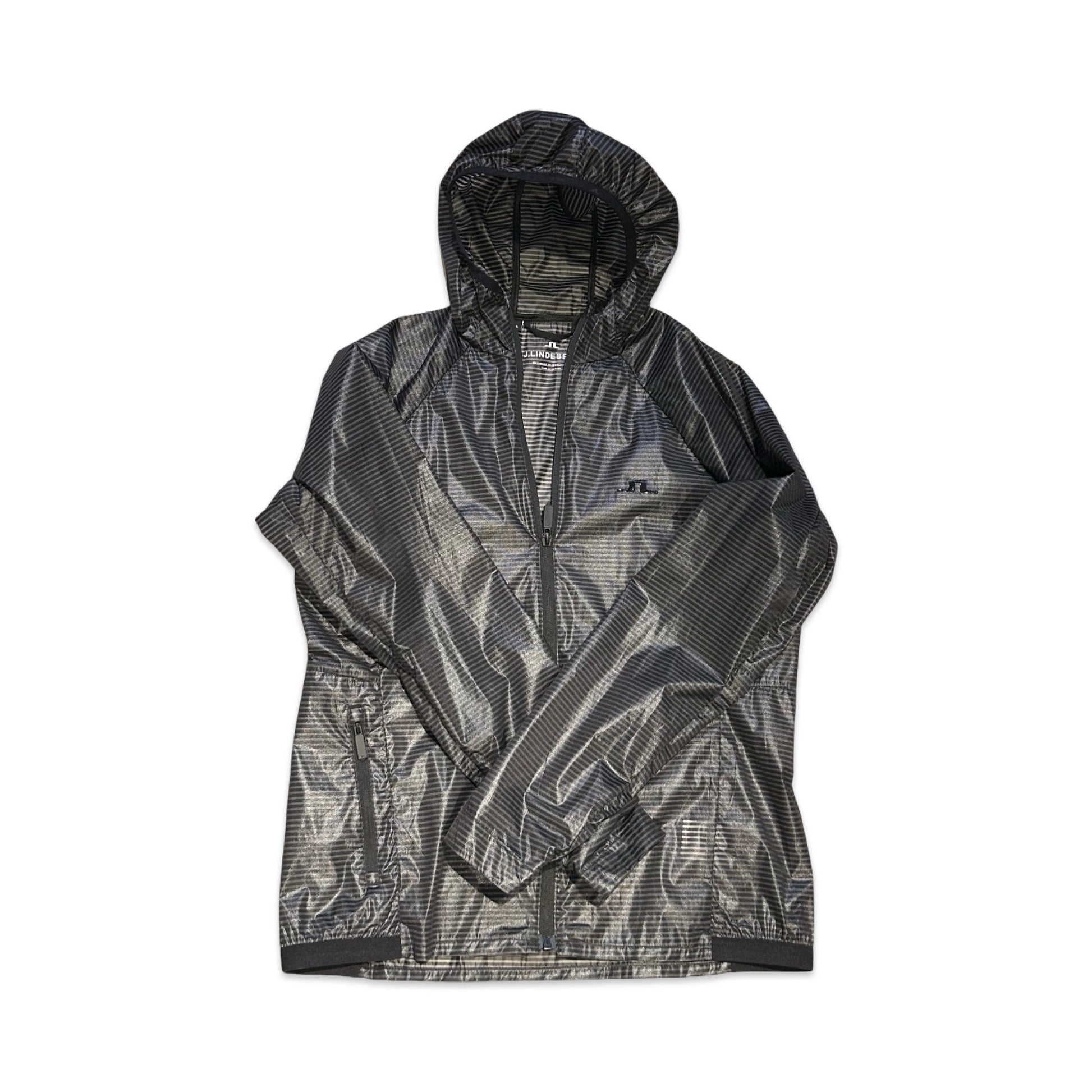 Jackan har en fast huva och hel dragkedja framtill. Två handfickor med dragkedja ger säker förvaring under aktivitet. Raglanärmar och den tunna, smidiga konstruktionen ger bra rörelsefrihet, medan elastiska ärmslut och nederkant hjälper till att hålla vinden ute och passformen på plats.